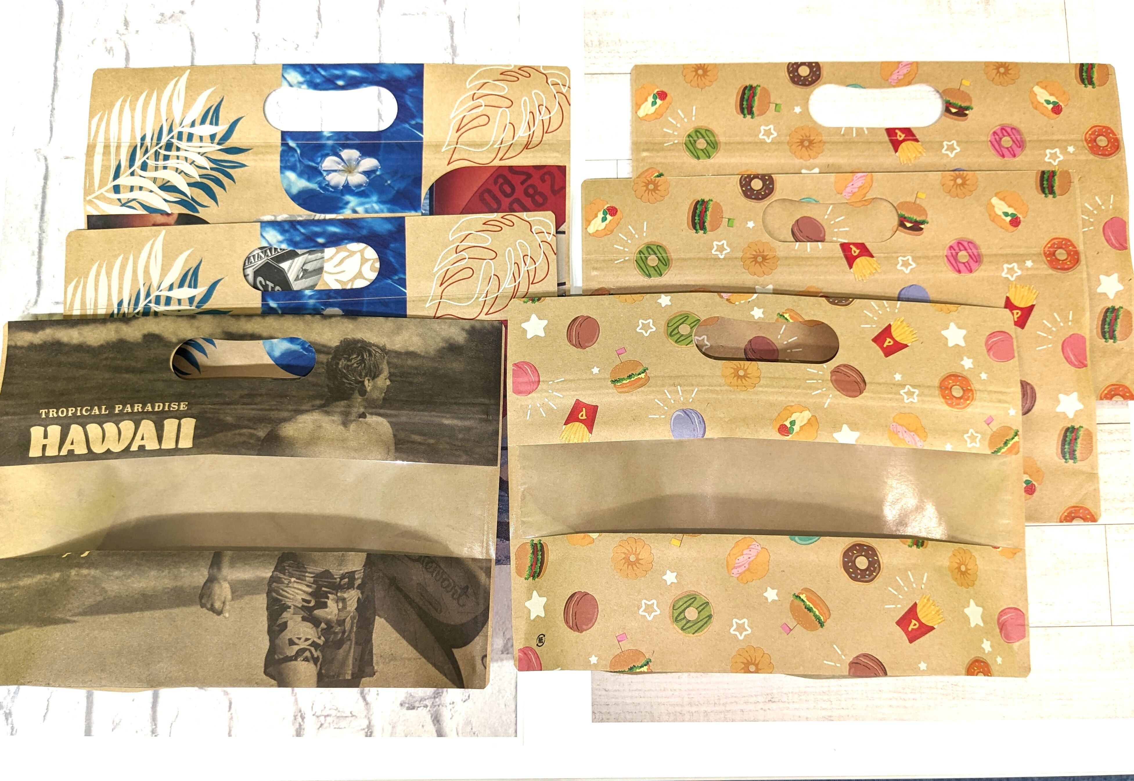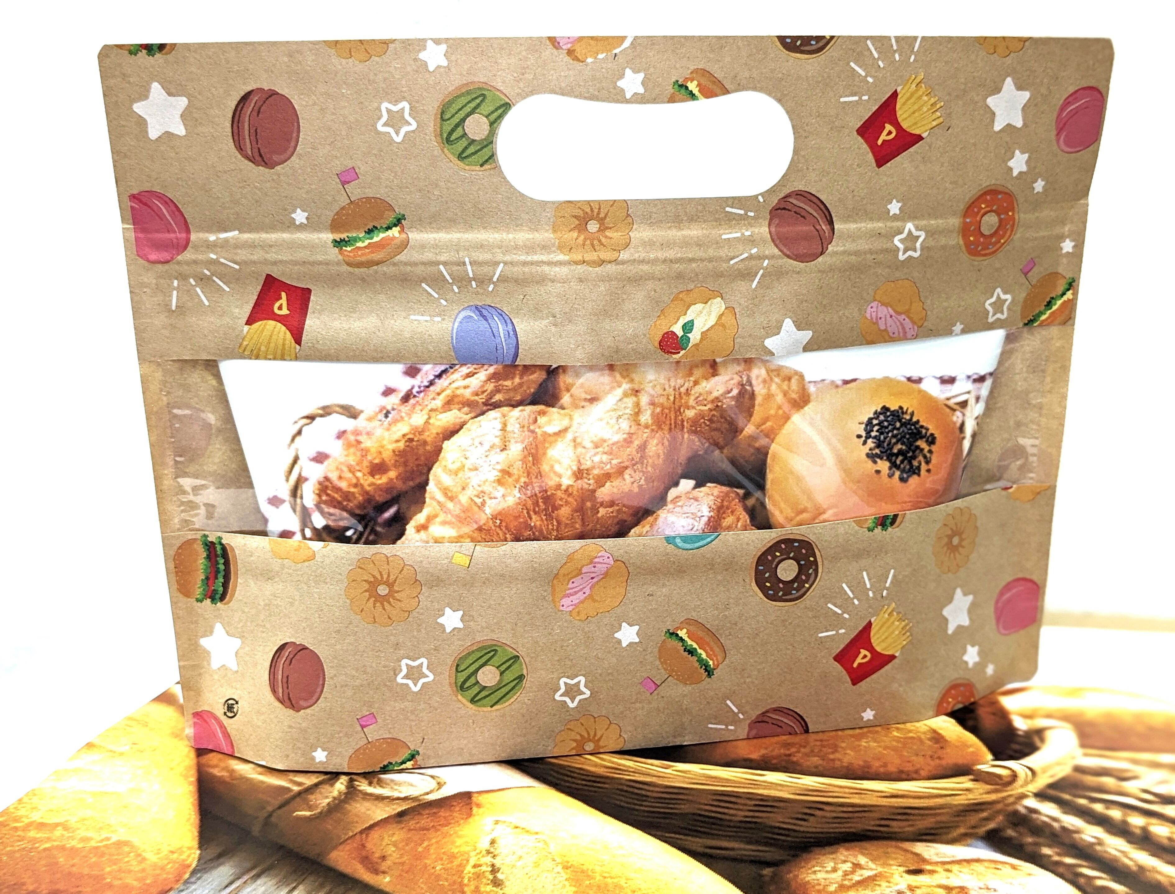 クラフト素材でチャック付きで衛生的、透明の窓がついており美味しさが見えて、内面はラミネートされていますので湿気にも強く、持ち手穴もついており持ち運びも便利です。
